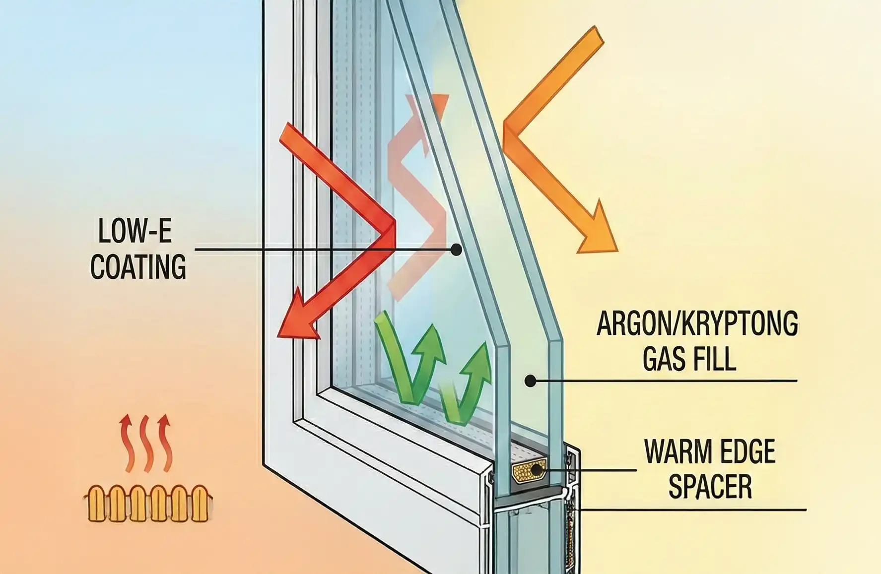 For our hot, humid summers, we recommend double-pane vinyl or fiberglass windows with Low-E coating and argon gas fill. These block heat gain while keeping your home cool and reducing UV damage to furniture and floors.